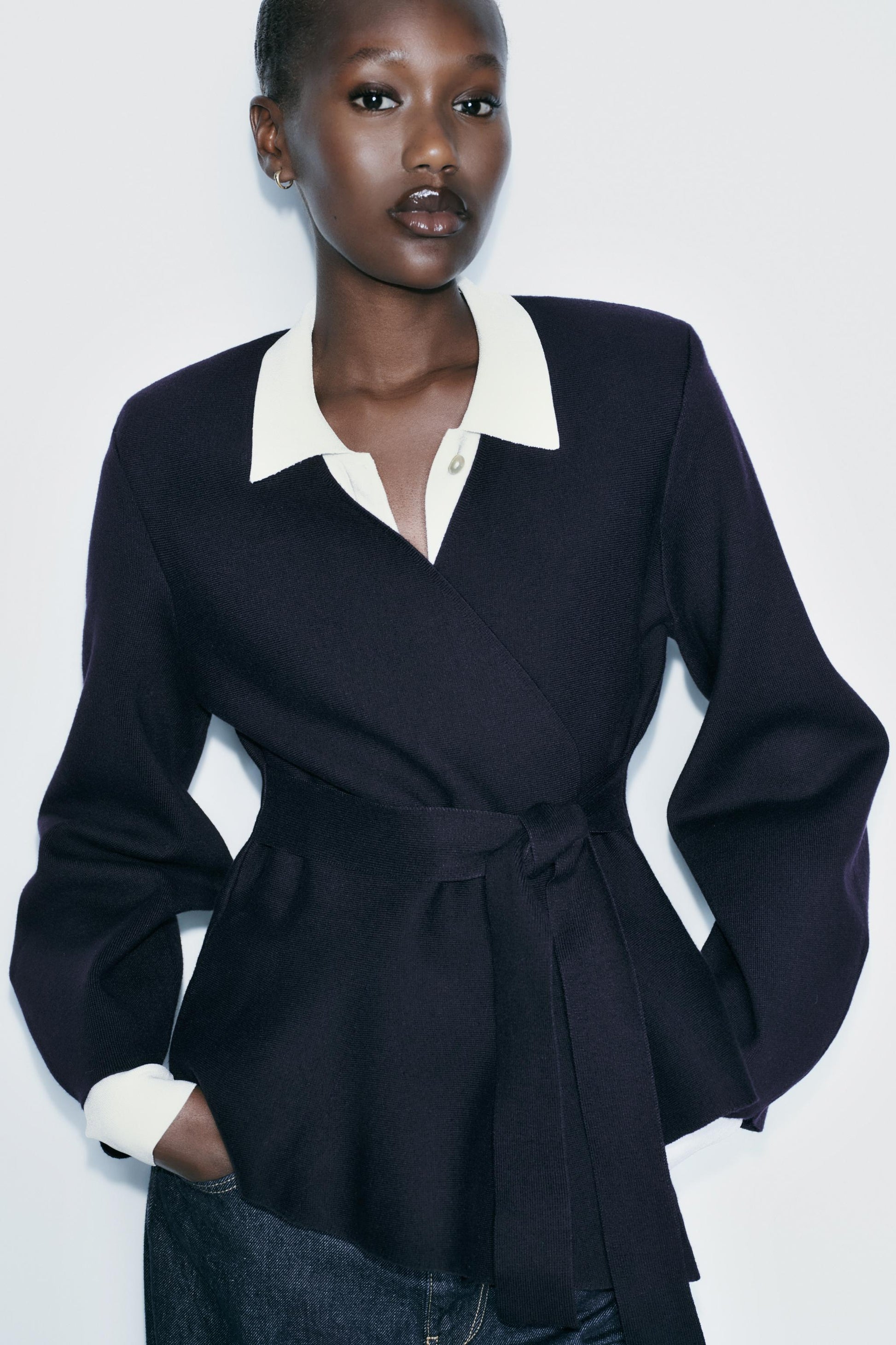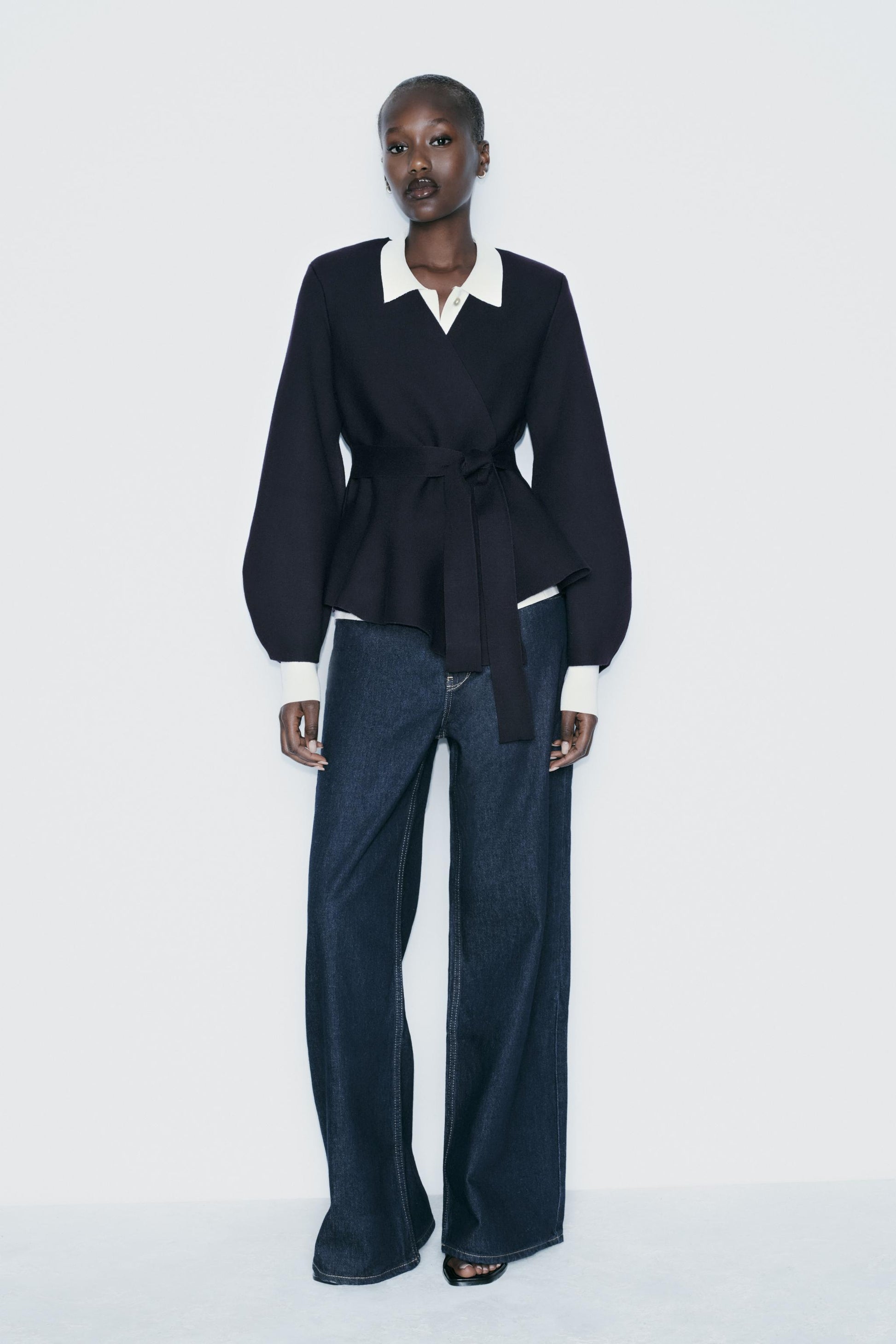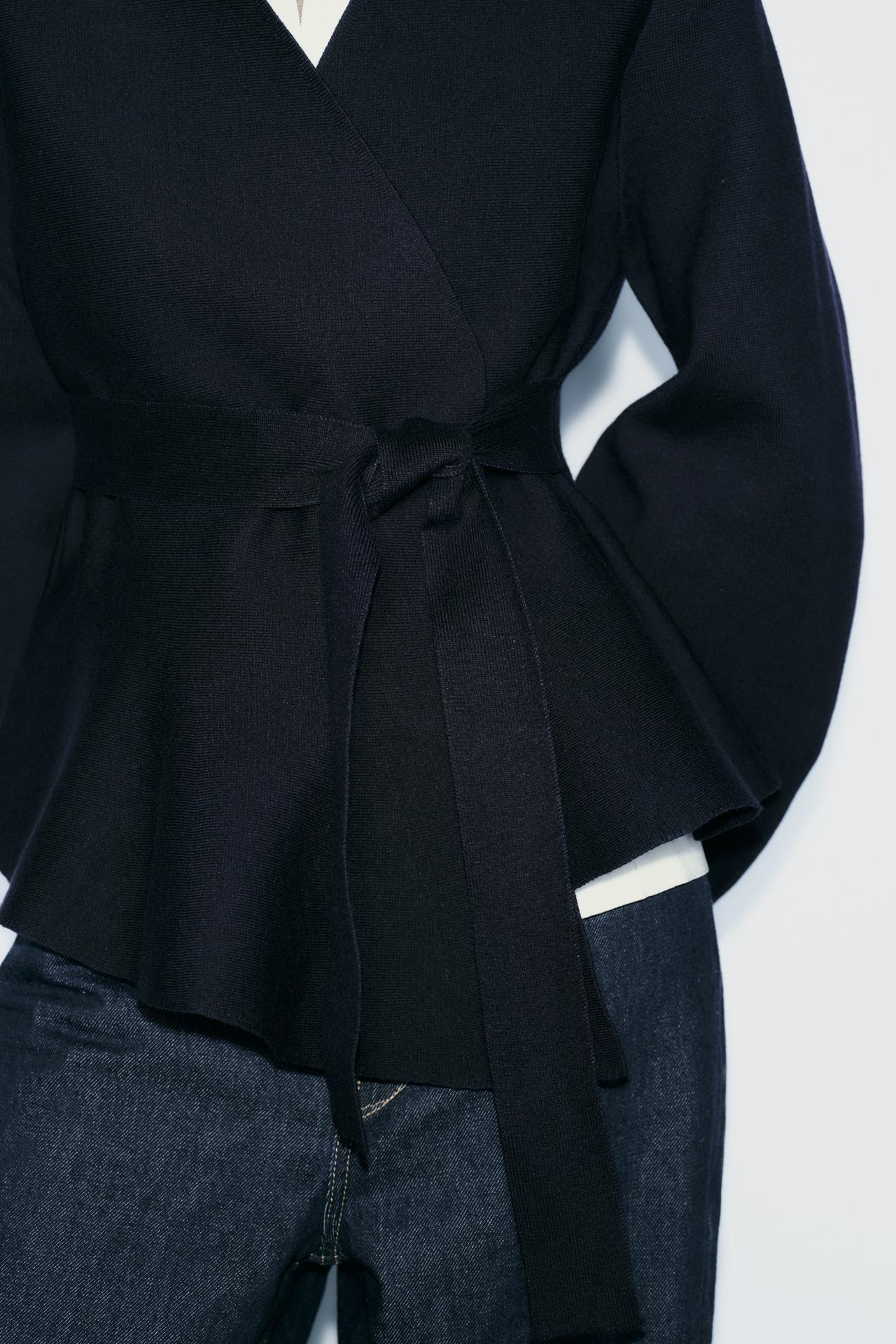 Gefertigt aus einem strukturierten Materialmix, überzeugt er durch seine taillierte Silhouette, betonte Schultern und einen weich fallenden Schößchenschnitt. Der integrierte Stoffgürtel betont die Taille und verleiht dem Look eine elegante Form.