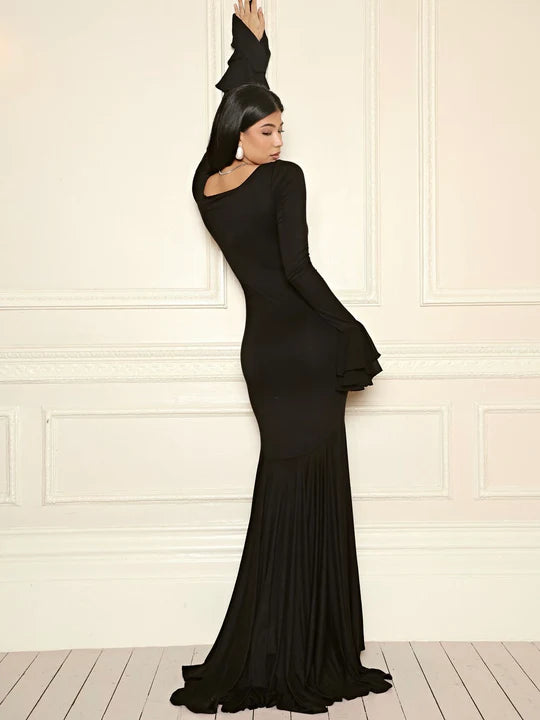 Ein lebendiges Maxikleid, das alle Blicke auf sich zieht. Mit gerüschten Ärmeln und einem verspielten Saum für eine feminine Note. Die taillierte Silhouette betont jede Körperform.