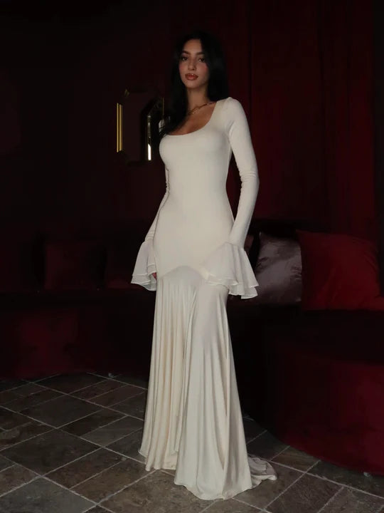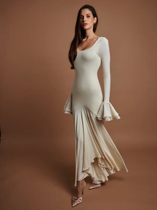 Ein lebendiges Maxikleid, das alle Blicke auf sich zieht. Mit gerüschten Ärmeln und einem verspielten Saum für eine feminine Note. Die taillierte Silhouette betont jede Körperform.