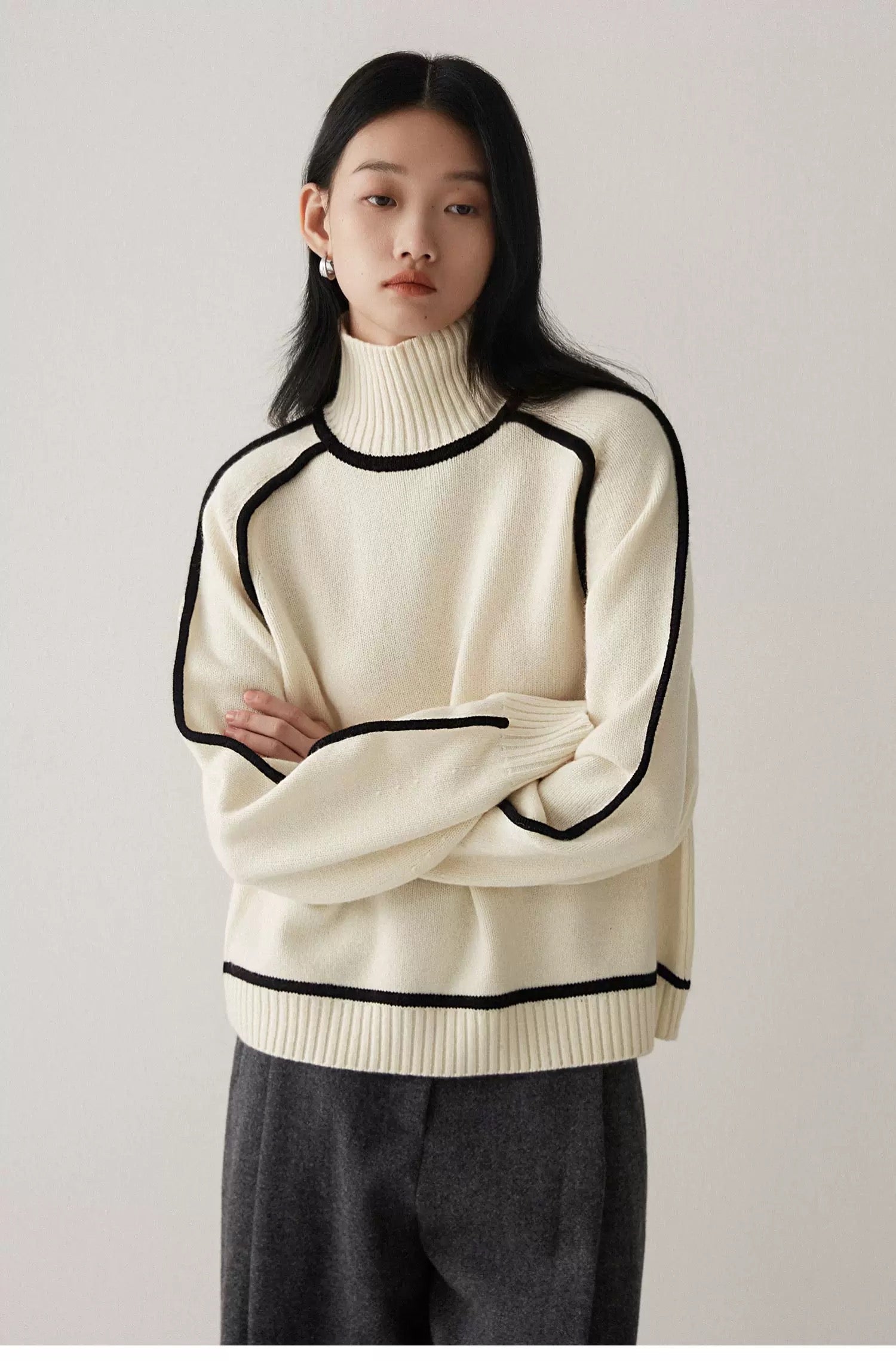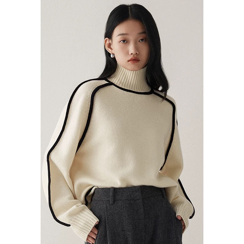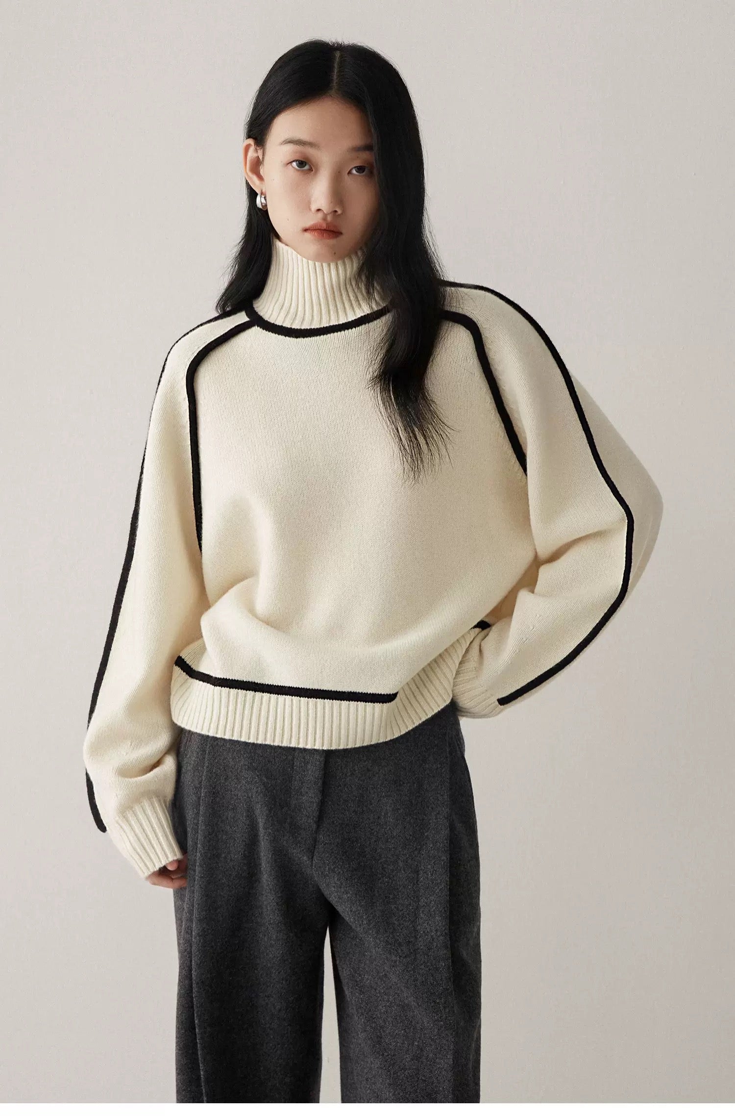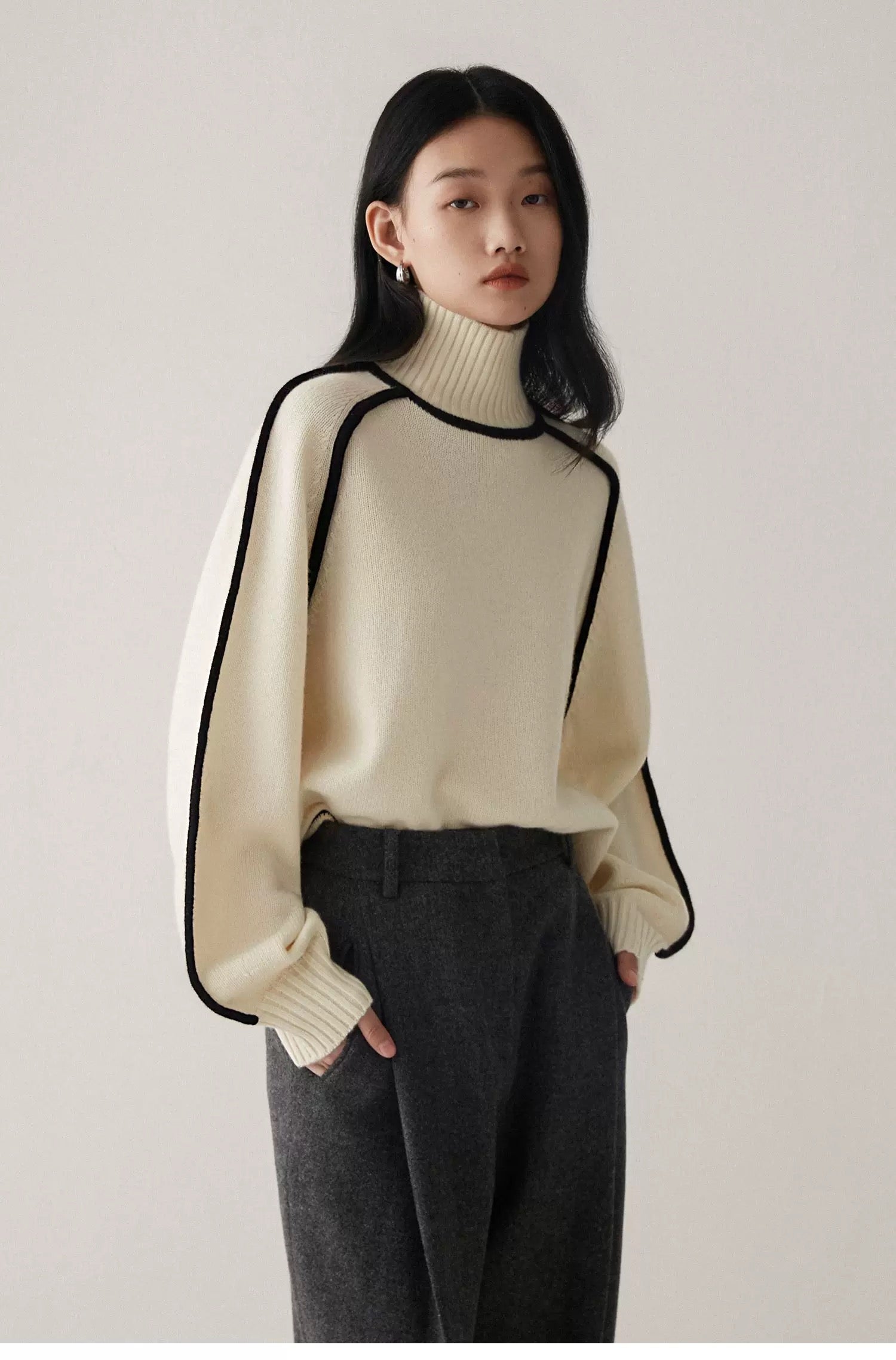 Ein Hauch von Pariser Eleganz trifft auf zeitlose Gemütlichkeit: Der Rollkragenpullover Élan de Neige überzeugt durch seine luxuriöse Haptik und ein minimalistisches Design. Feine Kontraste in Schwarz betonen die Silhouette und verleihen dem cremefarbenen Strick eine moderne Note. Der weiche Oversize-Schnitt und der gerippte Kragen sorgen für höchsten Tragekomfort – ideal für stilvolle Wintertage. Kombinierbar mit Wollhosen, Röcken oder Denim für einen edlen Alltagslook.
