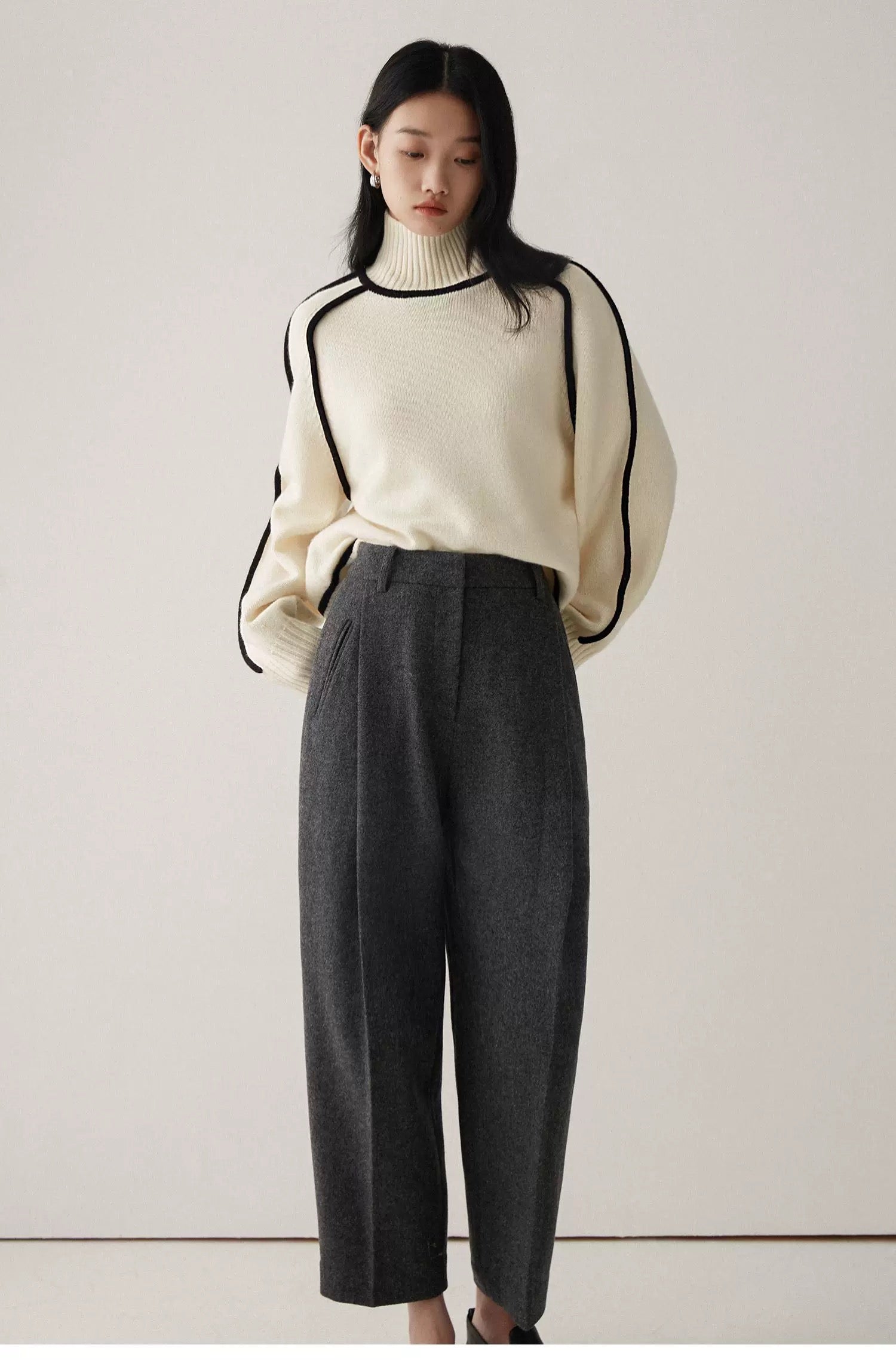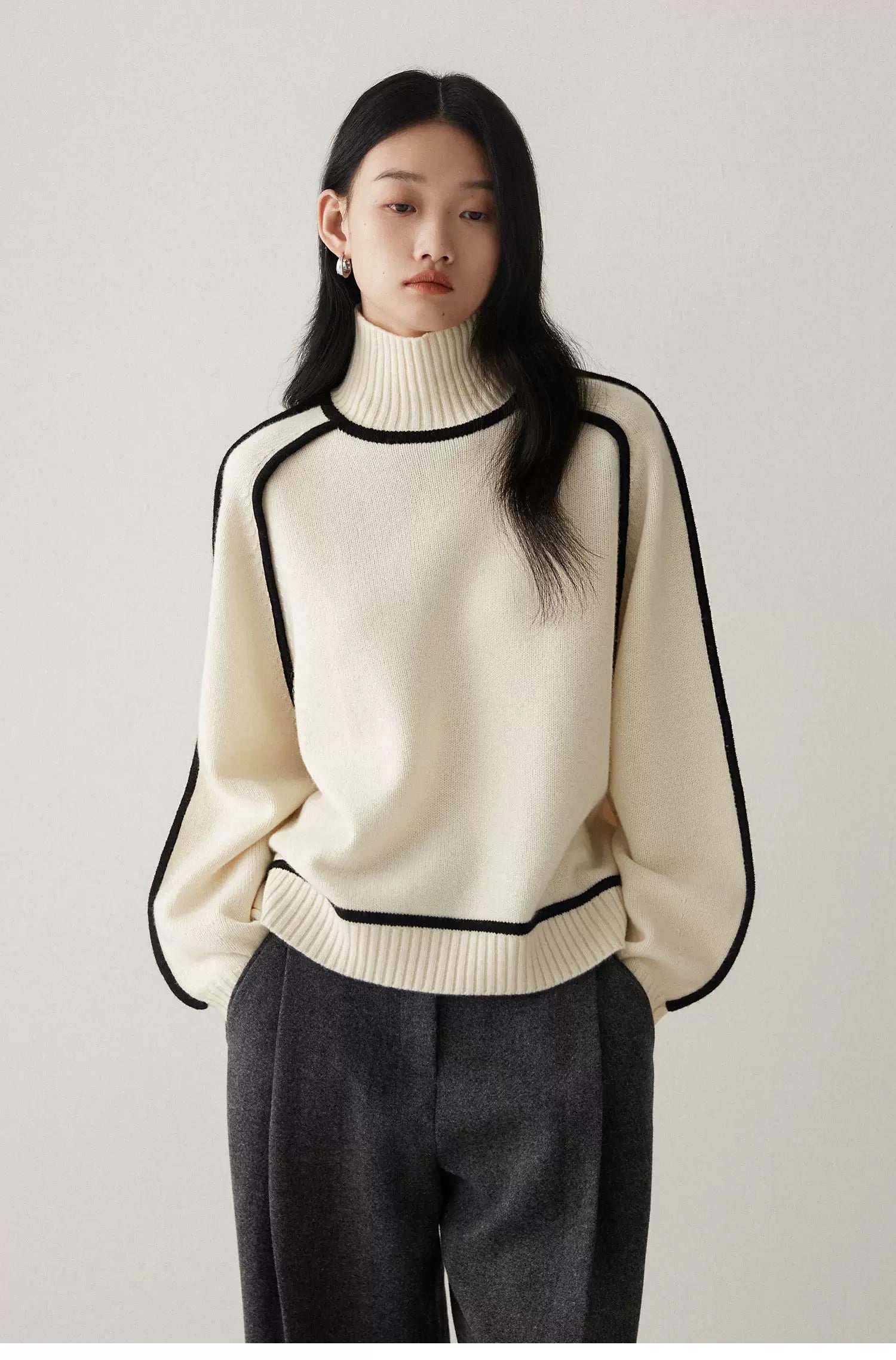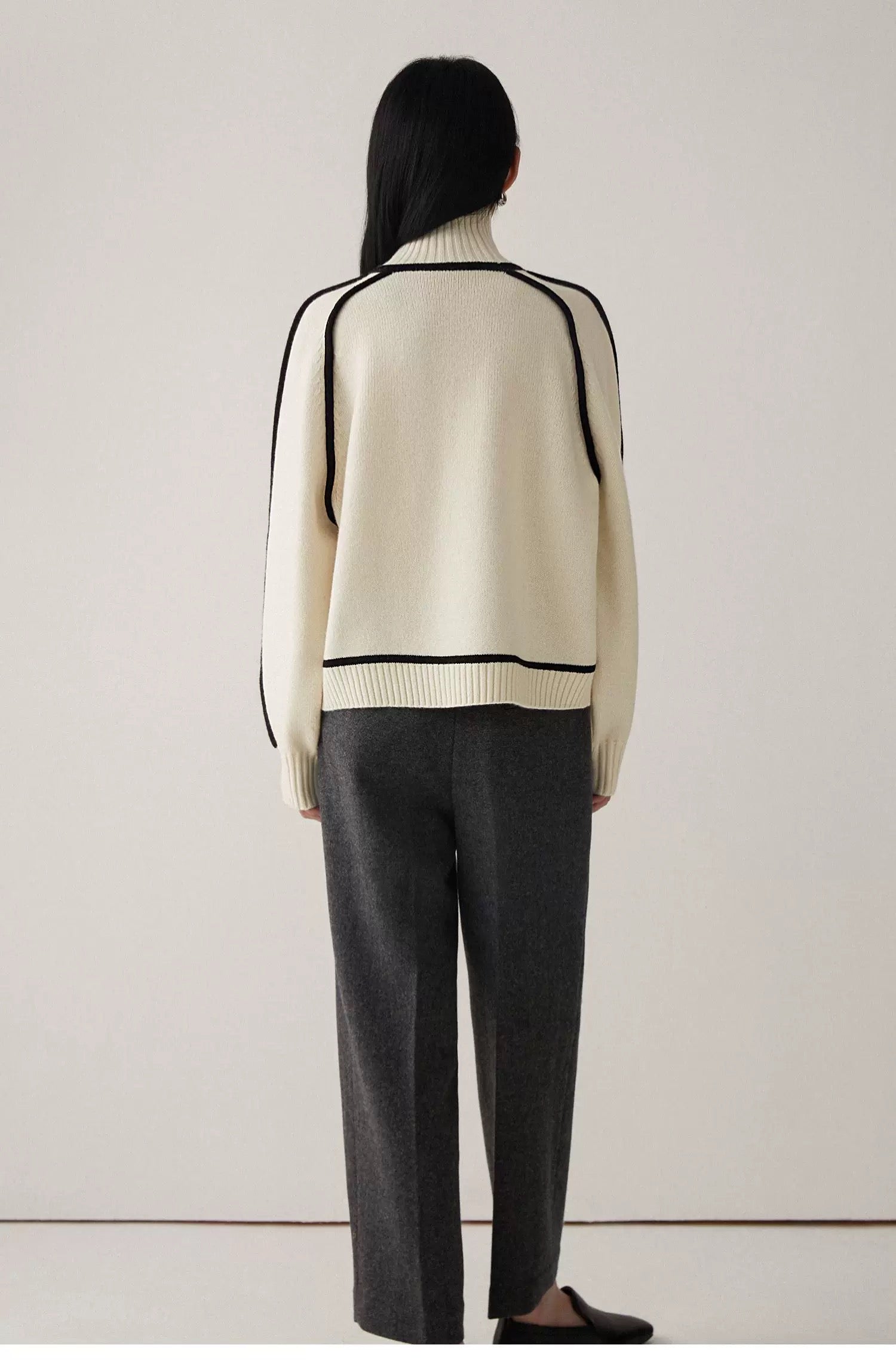 Ein Hauch von Pariser Eleganz trifft auf zeitlose Gemütlichkeit: Der Rollkragenpullover Élan de Neige überzeugt durch seine luxuriöse Haptik und ein minimalistisches Design. Feine Kontraste in Schwarz betonen die Silhouette und verleihen dem cremefarbenen Strick eine moderne Note. Der weiche Oversize-Schnitt und der gerippte Kragen sorgen für höchsten Tragekomfort – ideal für stilvolle Wintertage. Kombinierbar mit Wollhosen, Röcken oder Denim für einen edlen Alltagslook.