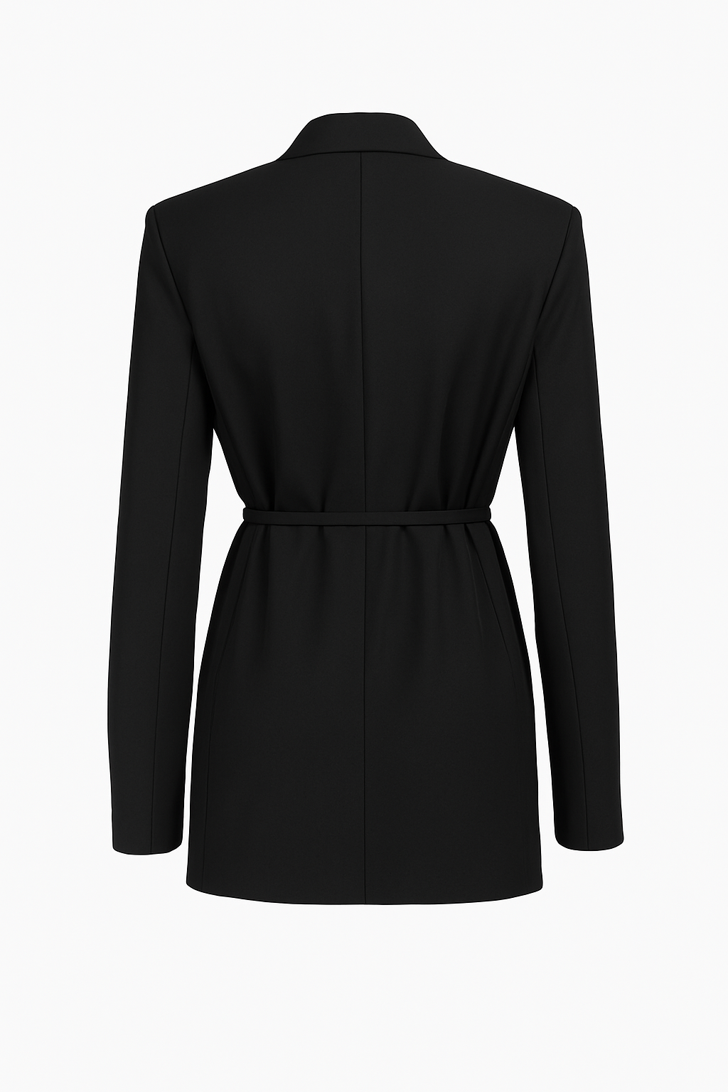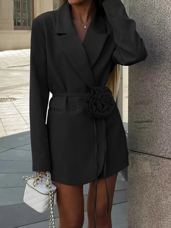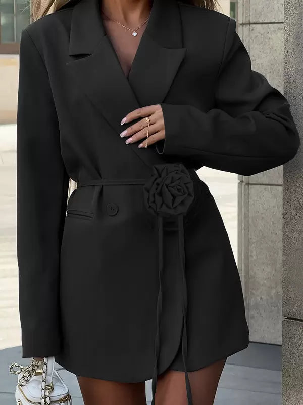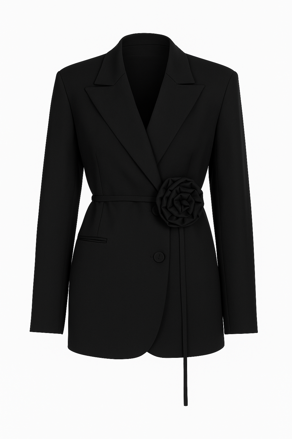 Flower Blazer Damen – Schwarz mit Bindegürtel & Blumen-Detail