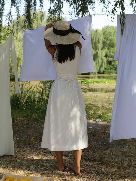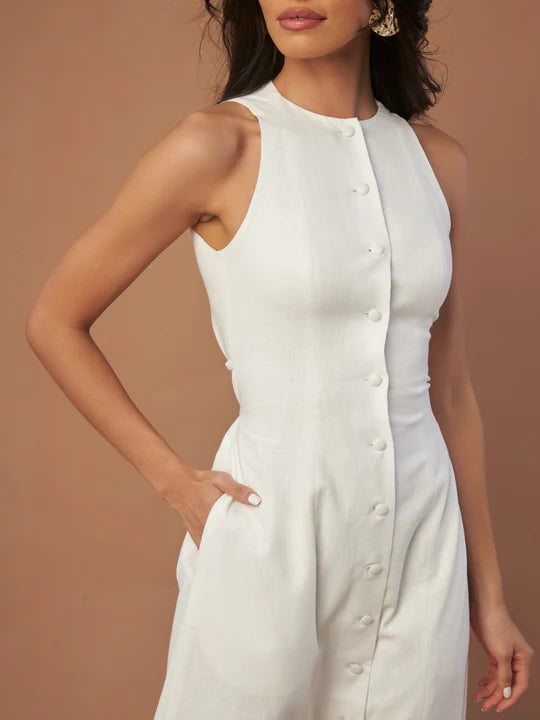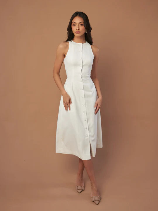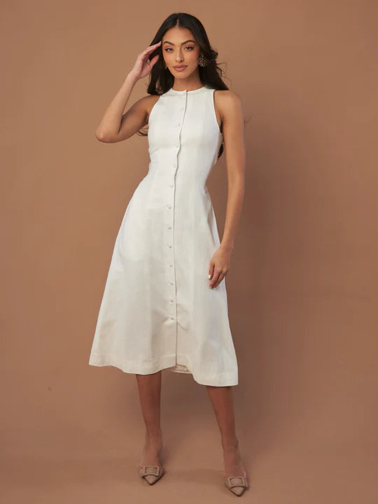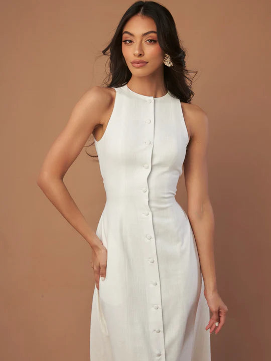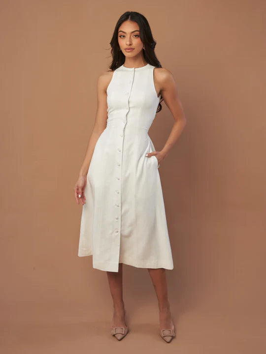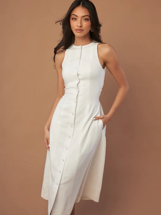 Dieses luftige Midikleid verbindet zeitlose Eleganz mit alltagstauglichem Komfort. Gefertigt aus einer leichten Leinen-Baumwoll-Mischung, ist es die ideale Wahl für warme Tage. Die durchgehende Knopfleiste verleiht dem Design eine klassische Note, während die taillierte Passform die Figur schön zur Geltung bringt.