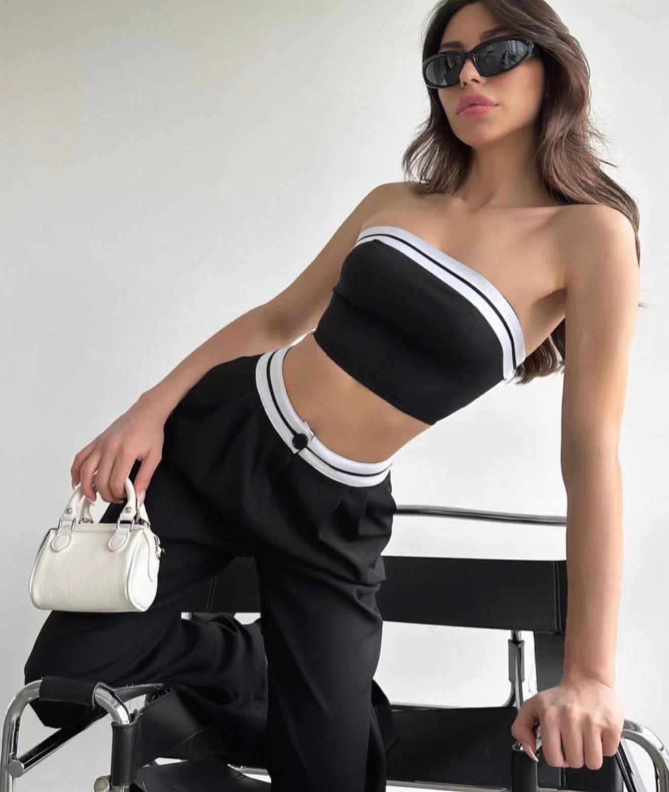 Zweiteiliges Set bestehend aus einem schmal geschnittenen Bandeau-Top und einer weit fallenden High-Waist-Hose mit sportlichem Bunddetail. Perfekte Verbindung von Komfort, Eleganz und urbanem Chic – ideal für stilbewusste Looks im Alltag oder auf Reisen.