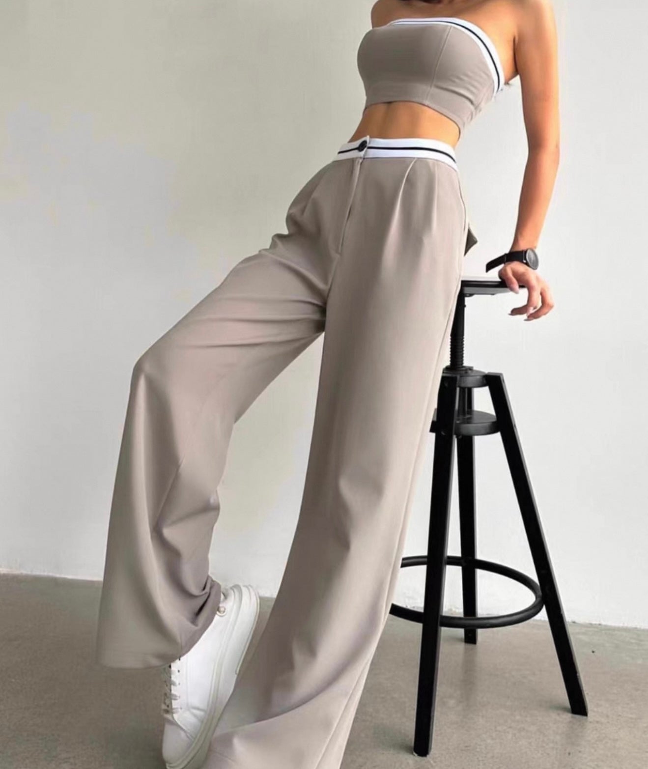 Zweiteiliges Set bestehend aus einem schmal geschnittenen Bandeau-Top und einer weit fallenden High-Waist-Hose mit sportlichem Bunddetail. Perfekte Verbindung von Komfort, Eleganz und urbanem Chic – ideal für stilbewusste Looks im Alltag oder auf Reisen.