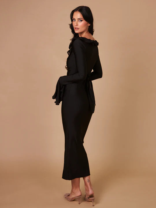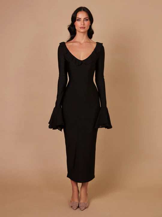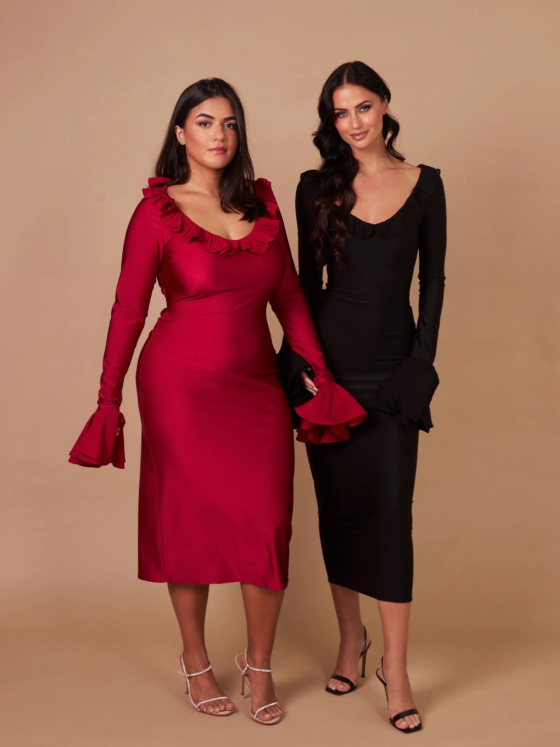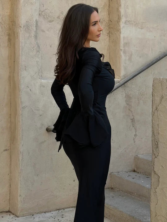 Mit Velours de Minuit trittst du stilvoll ins Rampenlicht. Das tiefrote, samtige Kleid schmiegt sich an deine Silhouette und sorgt mit ausgestellten Ärmeln und zartem Volant am Dekolleté für einen Hauch von Dramatik. Ein Design, das Stärke und Sinnlichkeit vereint – wie geschaffen für unvergessliche Abende.